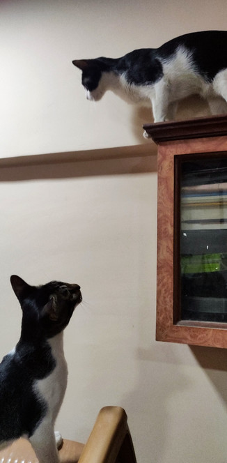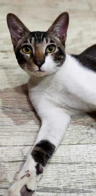 Genie is a super-playful male cat who was first boarded with us when he was just four months old. During his first stay, he became playmates with Babushka & Mini. During subsequent stays, by amazing coincidence he would frequently be boarded along with Mooncake. They forged a good friendship and Genie would always be around Mooncake who even taught him a few things, such as climbing on an unreachable spot above the shelf. Though not violent, Genie has a tendency to try and dominate other cats, even those twice his size! This little guy is surely a lionheart. He's quite friendly with humans and has never given us any trouble.